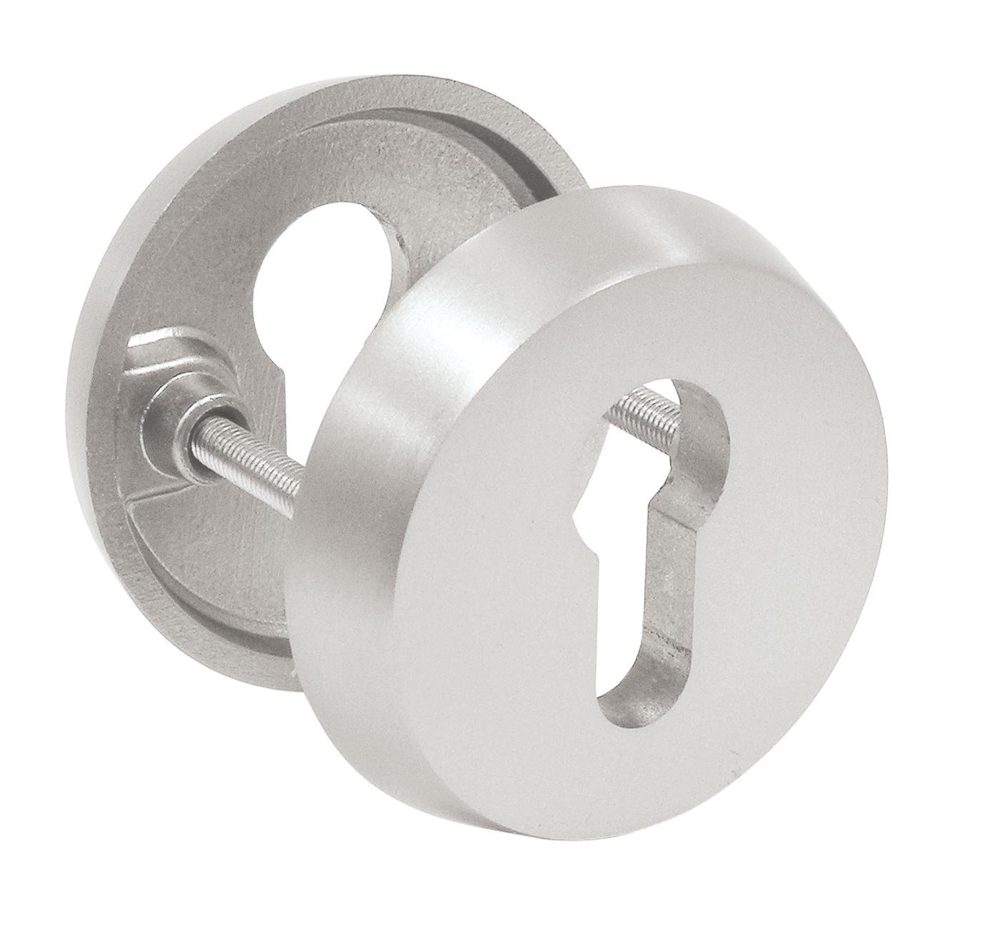 Bezpečnostní kulatá rozeta bez zakrytí válcové vložky je vyrobena z hliníku a má povrchovou úpravu.