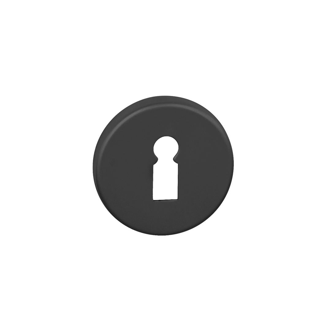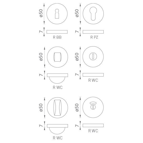 Kulatá rozeta je vyrobena z hliníku a má povrchové ošetření. Roseta má průměr 50 mm, tloušťku 7 mm a oválný otvor pro vnitřní klíč (BB), otvor pro vložku válce (PZ), toaletu s vestavěným klíčem a indikátorem. Balíček obsahuje 2 kusy rozet (pár) a toalety jsou v balíčku jako sada.