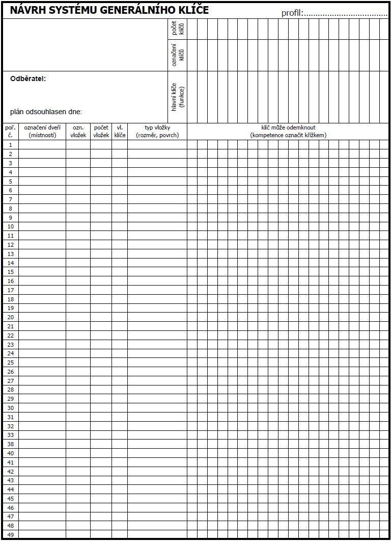 Obecný klíč (GK) - Obecný klíč zamkne všechny vložky do blokovacího systému.