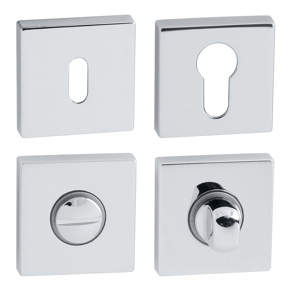 Čtvercová rozeta je vyrobena z vysoce kvalitních materiálů - zamak a je povrchově upravena. Vratná pružina rukojeti je uložena v plastovém pouzdře. Rozeta má rozměry 51 mm x 51 mm a oválný otvor pro vnitřní klíč (BB), otvor pro vložení cylindrické vložky (PZ) nebo toaletní soupravu se zabudovaným klíčem. Balení obsahuje 2 ks rozet (pár) a toaletní rozety jsou v balení jako sada.