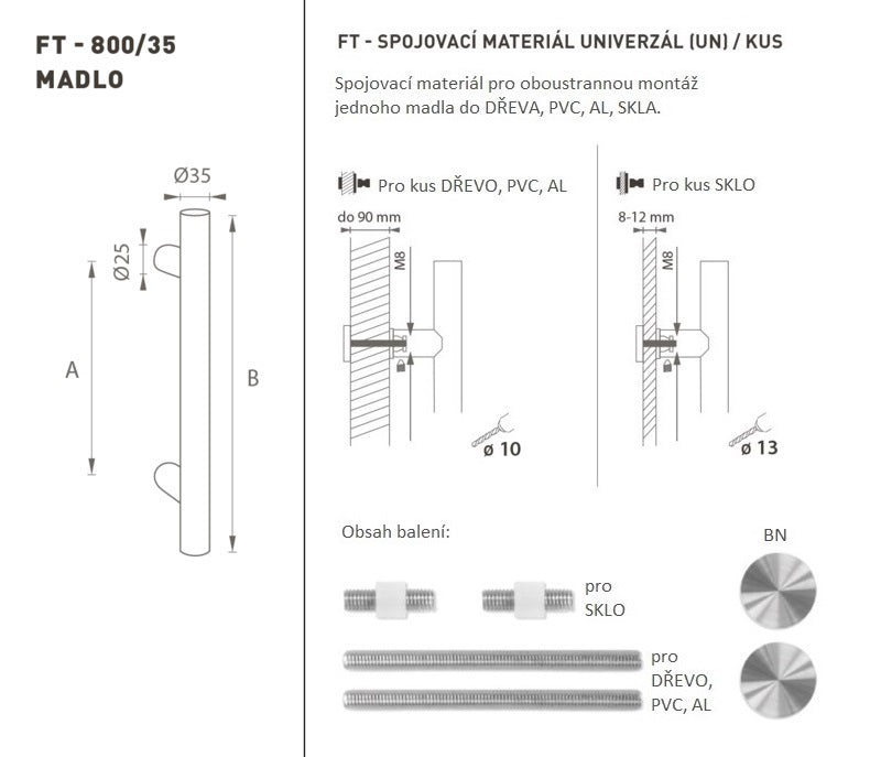 Rukojeť dveří je vyrobena z vysoce kvalitní nerezové oceli, známé jako nerezová ocel, a je ošetřena povrchem. Profil rukojeti je 35 mm. Univerzální (UN) sada obsahuje upevňovací prvky pro oboustranné montáž jedné rukojeti ve dřevě, PVC, AL, Glass.