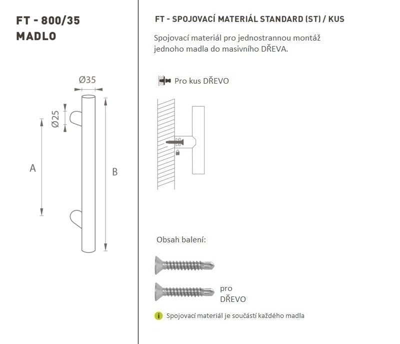 Rukojeť dveří je vyrobena z vysoce kvalitní nerezové oceli, známé jako nerezová ocel, a je ošetřena povrchem. Profil rukojeti je 35 mm. Rukojeť obsahuje šrouby 6 x 45 mm.