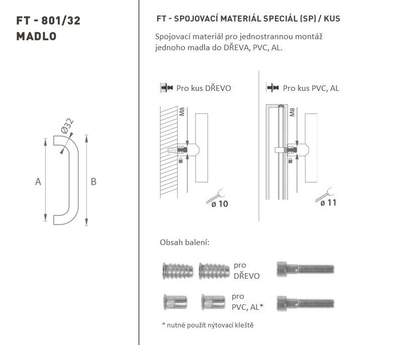 Rukojeť dveří je vyrobena z vysoce kvalitní nerezové oceli, známé jako nerezová ocel, a je ošetřena povrchem. Profil rukojeti je 32 mm. Speciální (SP) sada obsahuje upevňovací prvky pro jednostrannou montáž jedné rukojeti ve dřevě, PVC, AL.