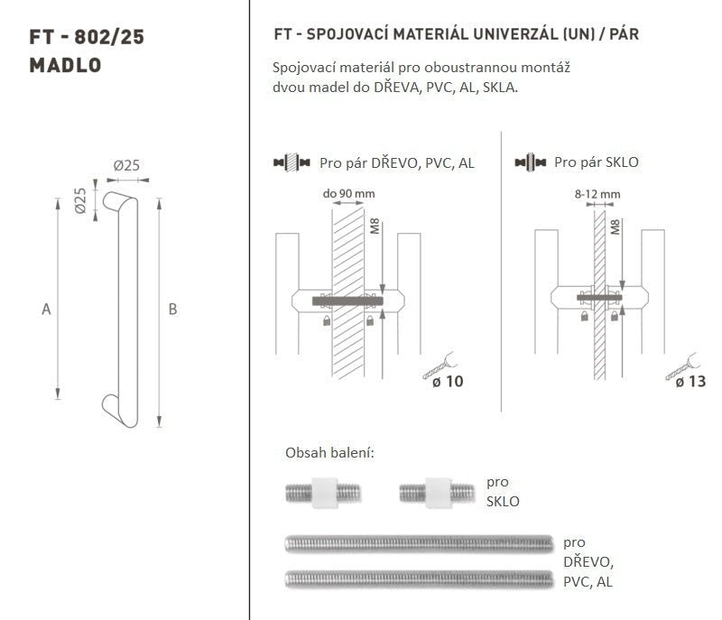 Rukojeť dveří je vyrobena z vysoce kvalitní nerezové oceli, známé jako nerezová ocel, a je ošetřena povrchem. Profil rukojeti je 25 mm. Univerzální (UN) sada obsahuje upevňovací prvky pro oboustranné montáž dvou zábradlí ve dřevě, PVC, Al, Glass.