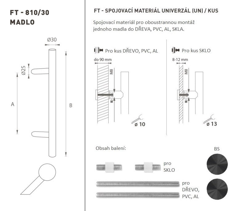 Rukojeť dveří je vyrobena z vysoce kvalitní nerezové oceli, známé jako nerezová ocel, a je ošetřena povrchem. Profil rukojeti je 30 mm. Univerzální (UN) sada obsahuje upevňovací prvky pro oboustranné montáž jedné rukojeti ve dřevě, PVC, AL, Glass. Rukojeť s délkou 1600, 1800 a 2000 mm má 3 držadla.