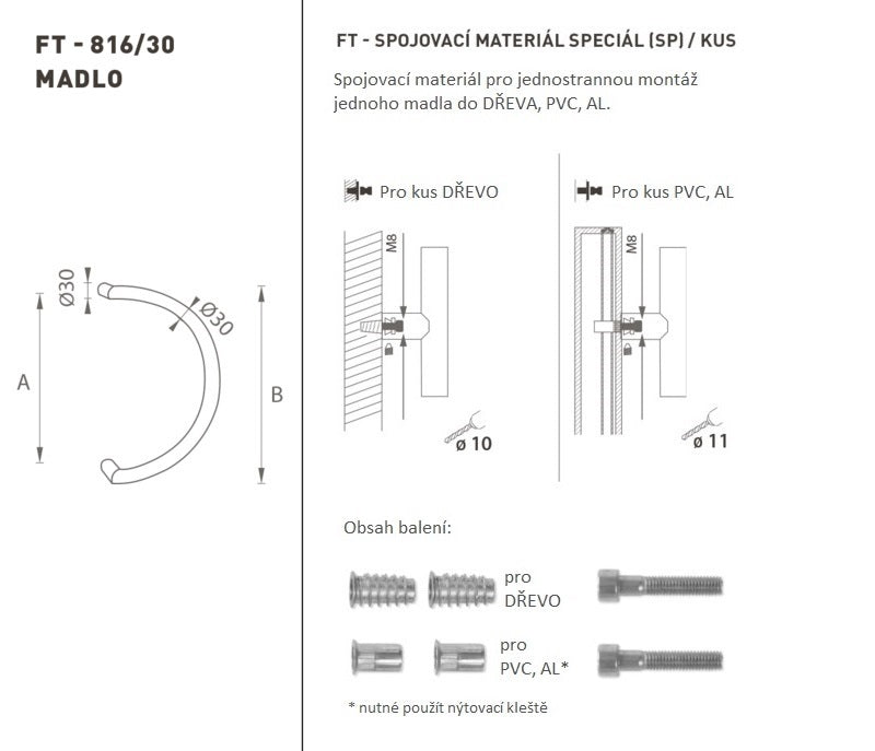 Rukojeť dveří je vyrobena z vysoce kvalitní nerezové oceli, známé jako nerezová ocel, a je ošetřena povrchem. Profil rukojeti je 30 mm. Speciální (SP) sada obsahuje upevňovací prvky pro jednostrannou montáž jedné rukojeti ve dřevě, PVC, AL.