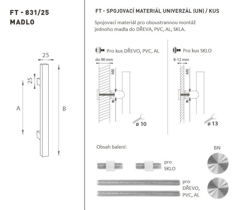 Rukojeť dveří je vyrobena z vysoce kvalitní nerezové oceli, známé jako nerezová ocel, a je ošetřena povrchem. Profil rukojeti je 25 x 25 mm. Univerzální (UN) sada obsahuje upevňovací prvky pro oboustranné montáž jedné rukojeti ve dřevě, PVC, AL, Glass.