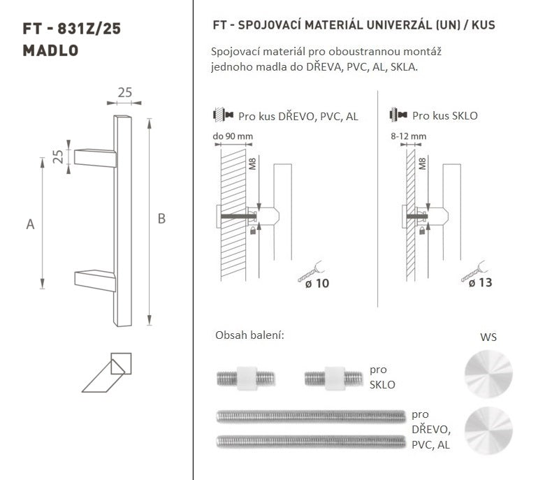Rukojeť dveří je vyrobena z vysoce kvalitní nerezové oceli, známé jako nerezová ocel, a je ošetřena povrchem. Profil rukojeti je 25 x 25 mm. Univerzální (UN) sada obsahuje upevňovací prvky pro oboustranné montáž jedné rukojeti ve dřevě, PVC, AL, Glass.