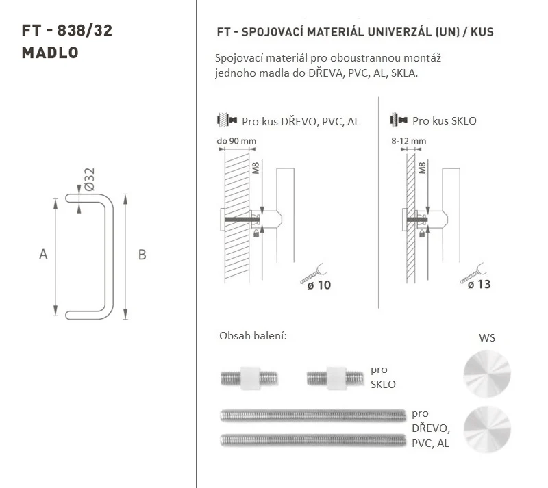 Rukojeť dveří je vyrobena z vysoce kvalitní nerezové oceli, známé jako nerezová ocel, a je ošetřena povrchem. Profil rukojeti je 32 mm. Univerzální (UN) sada obsahuje upevňovací prvky pro oboustranné montáž dvou zábradlí ve dřevě, PVC, Al, Glass.