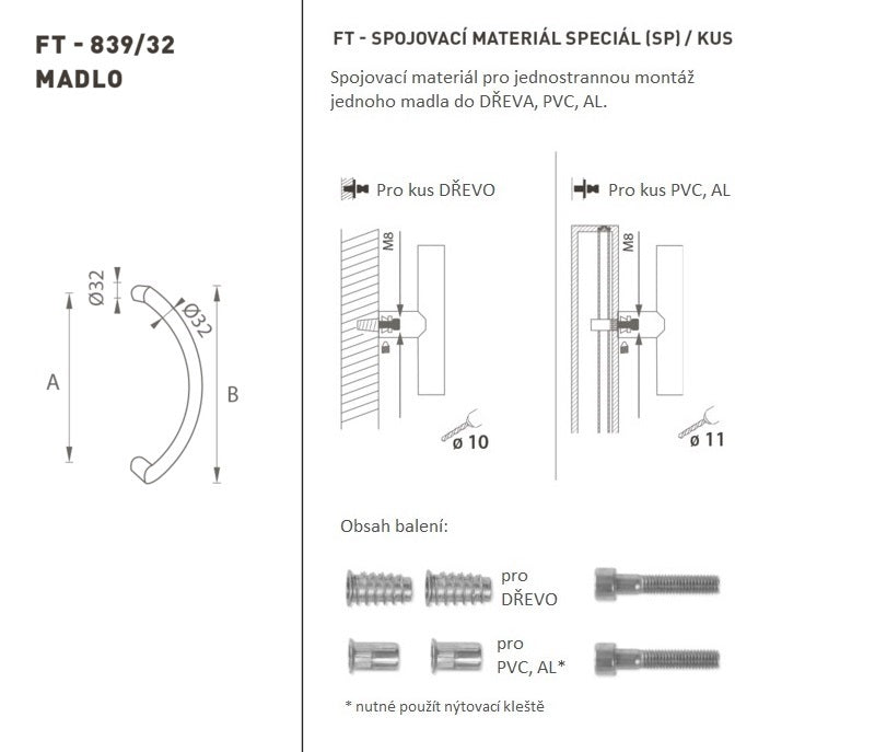 Rukojeť dveří je vyrobena z vysoce kvalitní nerezové oceli, známé jako nerezová ocel, a je ošetřena povrchem. Profil rukojeti je 32 mm. Speciální (SP) sada obsahuje upevňovací prvky pro jednostrannou montáž jedné rukojeti ve dřevě, PVC, AL.