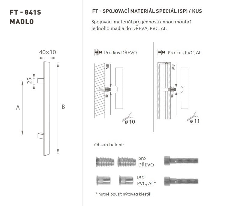 Rukojeť dveří je vyrobena z vysoce kvalitní nerezové oceli, známé jako nerezová ocel, a je ošetřena povrchem. Profil rukojeti je 40 x 10 mm. Speciální (SP) sada obsahuje upevňovací prvky pro jednostrannou montáž jedné rukojeti ve dřevě, PVC, AL.