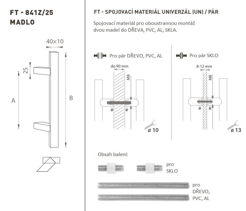 Rukojeť dveří je vyrobena z vysoce kvalitní nerezové oceli, známé jako nerezová ocel, a je ošetřena povrchem. Profil rukojeti je 40 x 10 mm. Univerzální (UN) sada obsahuje upevňovací prvky pro oboustranné montáž jedné rukojeti ve dřevě, PVC, AL, Glass. Rukojeť s délkou 1800 mm má 3 držadla.