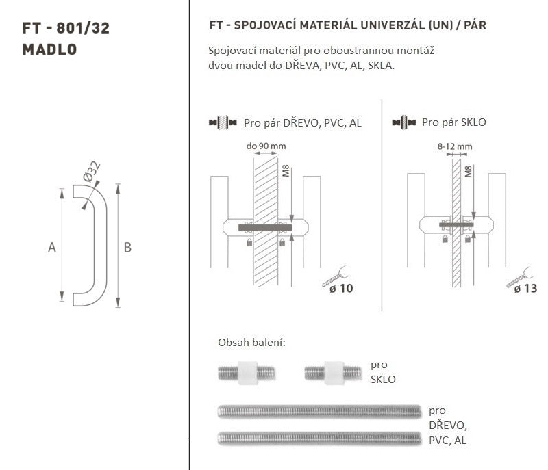 Klika dveří je vyrobena z kvalitní nerezové oceli, známé jako nerezová ocel, a je povrchově upravena. Profil rukojeti je 32 mm. Sada UNIVERSAL (UN) obsahuje spojovací prvky pro oboustrannou montáž dvou madel do dřeva, PVC, AL, skla.