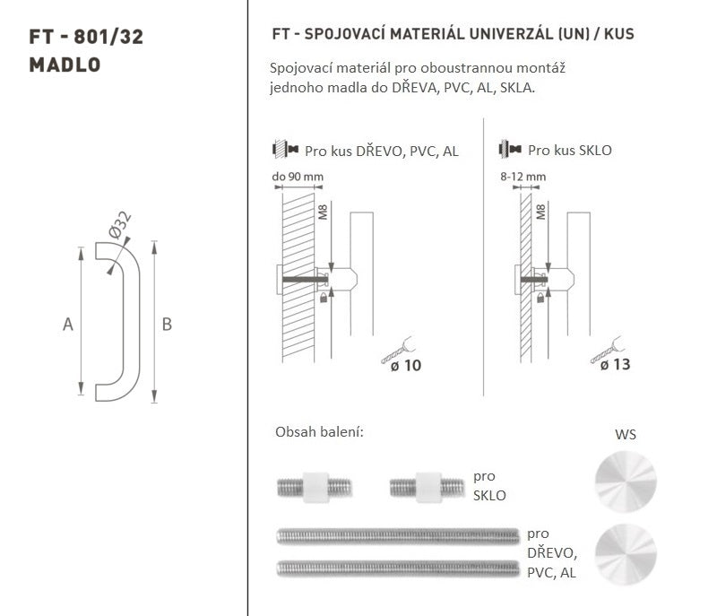 Klika dveří je vyrobena z kvalitní nerezové oceli, známé jako nerezová ocel, a je povrchově upravena. Profil rukojeti je 32 mm. Sada UNIVERSAL (UN) obsahuje upevňovací prvky pro oboustrannou montáž jedné rukojeti do dřeva, PVC, AL, skla.