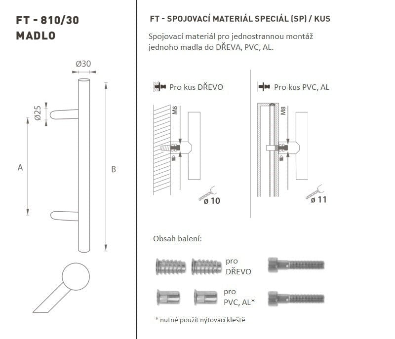 Klika dveří je vyrobena z kvalitní nerezové oceli, známé jako nerezová ocel, a je povrchově upravena. Profil rukojeti je 30 mm. Sada SPECIAL (SP) obsahuje upevňovací prvky pro jednostrannou montáž jedné rukojeti do dřeva, PVC, AL. Rukojeť o délce 1600, 1800 a 2000 mm má 3 rukojeti.
