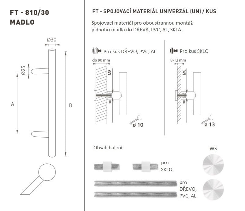 Klika dveří je vyrobena z kvalitní nerezové oceli, známé jako nerezová ocel, a je povrchově upravena. Profil rukojeti je 30 mm. Sada UNIVERSAL (UN) obsahuje upevňovací prvky pro oboustrannou montáž jedné rukojeti do dřeva, PVC, AL, skla. Rukojeť o délce 1600, 1800 a 2000 mm má 3 rukojeti.