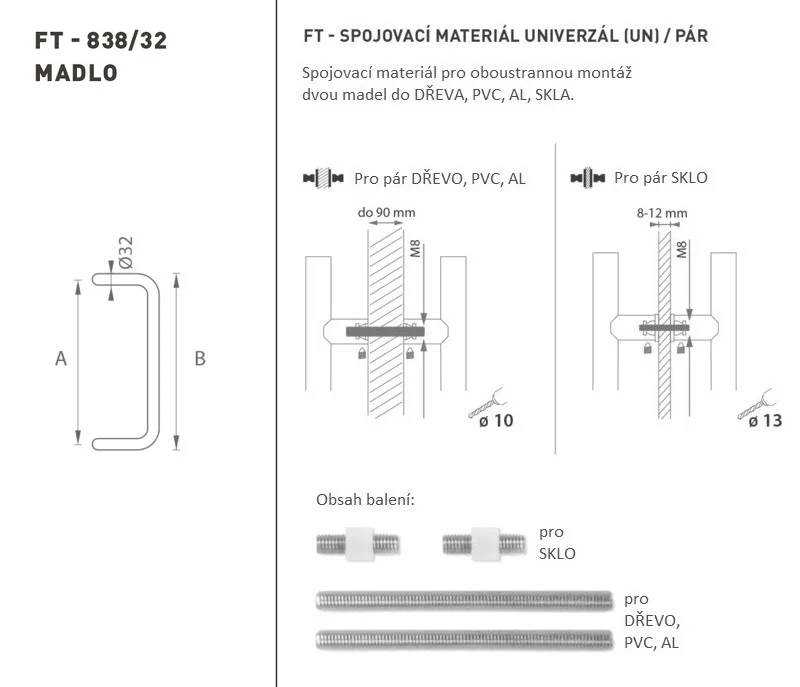 Klika dveří je vyrobena z kvalitní nerezové oceli, známé jako nerezová ocel, a je povrchově upravena. Profil rukojeti je 32 mm. Sada UNIVERSAL (UN) obsahuje spojovací prvky pro oboustrannou montáž dvou madel do dřeva, PVC, AL, skla.