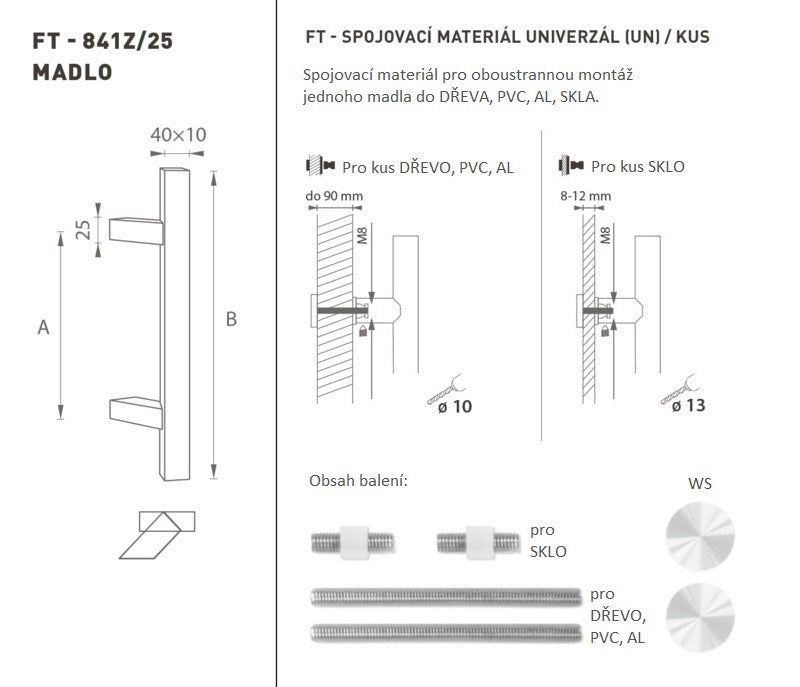 Klika dveří je vyrobena z kvalitní nerezové oceli, známé jako nerezová ocel, a je povrchově upravena. Profil rukojeti je 40 x 10 mm. Sada UNIVERSAL (UN) obsahuje upevňovací prvky pro oboustrannou montáž jedné rukojeti do dřeva, PVC, AL, skla.