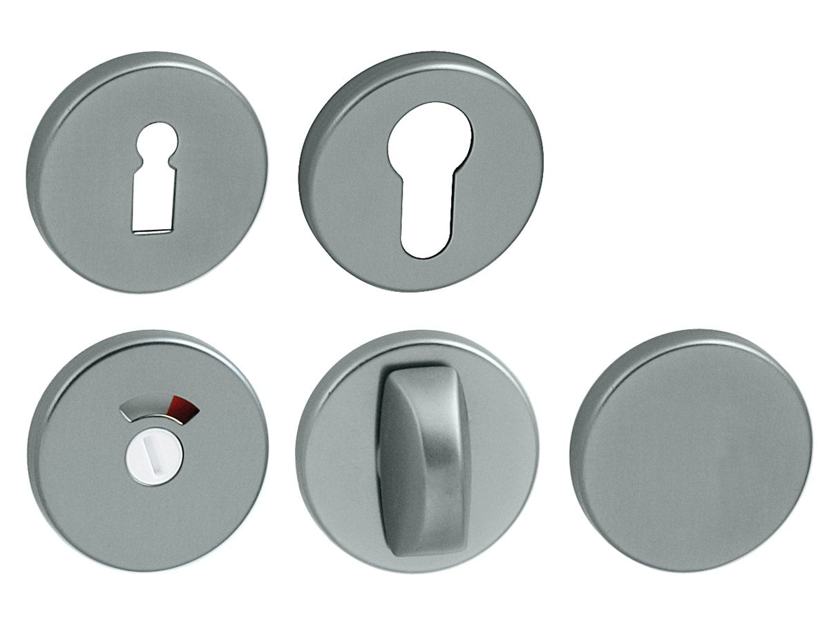 Kulatá rozeta je vyrobena z hliníku a má povrchové ošetření. Roseta má průměr 50 mm, tloušťku 8 mm a oválný otvor pro vnitřní klíč (BB), otvor pro vložku válce (PZ), WC sadu s vestavěným klíčem a indikátorem nebo rozestavou bez díry, tzv. Plug. Balíček obsahuje 2 kusy rozet (pár) a toalety jsou do balíčku zahrnuty jako sada.