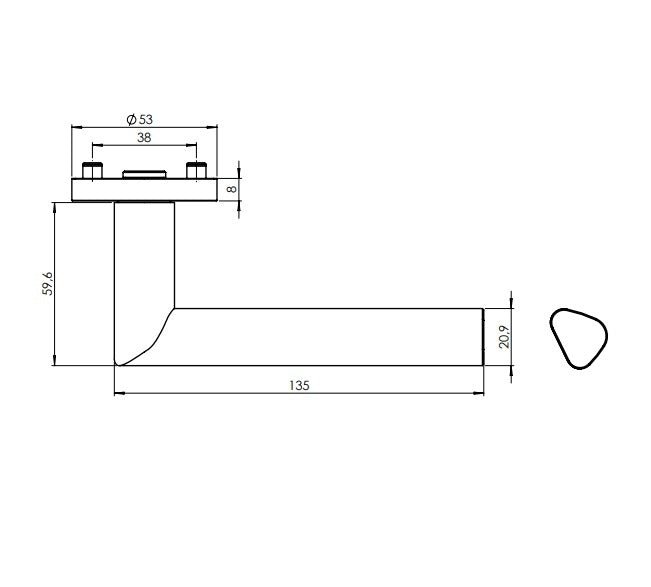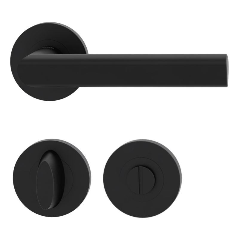 Mechanismus rukojeti zahrnuje návratovou pružinu. Výčnělky na rozetu brání jejímu převrácení a šrouby pro prošroubování celou šířkou dveří zaručují silnější a stabilnější přizpůsobení armatur.