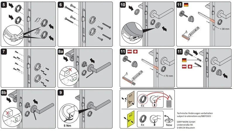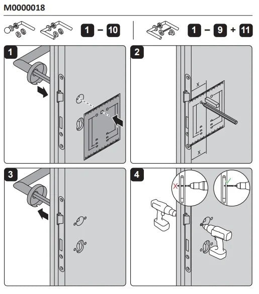 Standardně je kování dodáváno se šrouby a čtyřhranem (8 x 8 mm) pro tloušťku dveří 38 - 45 mm.