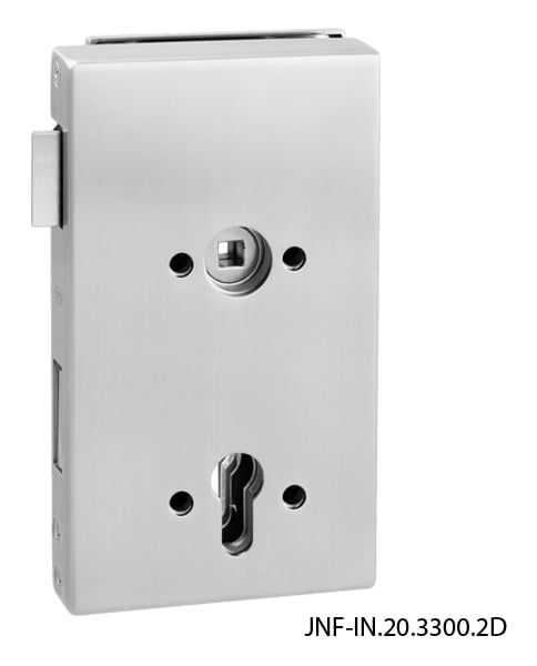 Dvojice děr ve skleněné skříni pro zámek a úder v řadě JNF - B má průměr 50 mm.