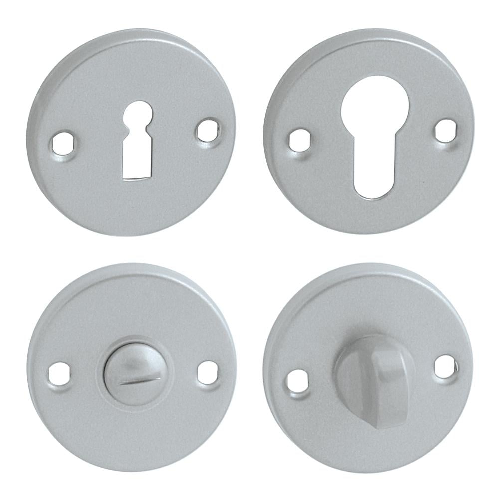 Kulatá rozeta je vyrobena z hliníku a má povrchové ošetření. Roseta má průměr 54 mm, tloušťku 8 mm a oválný otvor pro vnitřní klíč (BB), otvor pro vložku válce (Pz) nebo WC sadu s vestavěným klíčem. Balíček obsahuje 2 kusy rozet (pár) a toalety jsou v balíčku jako sada.