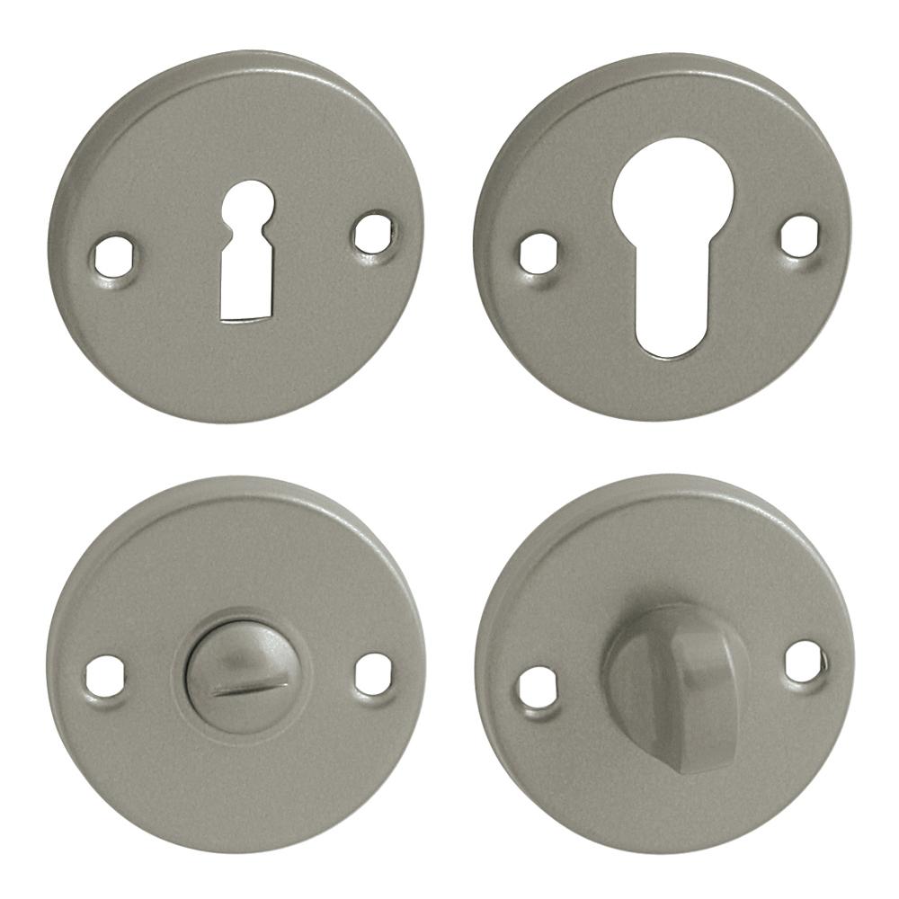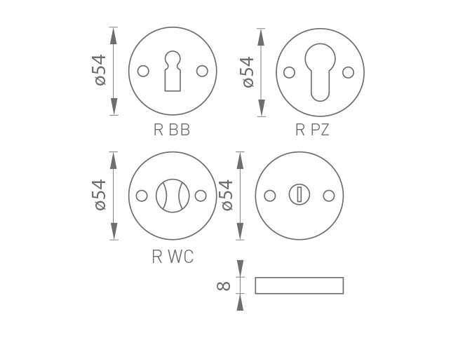 Kulatá rozeta je vyrobena z hliníku a má povrchové ošetření. Roseta má průměr 54 mm, tloušťku 8 mm a oválný otvor pro vnitřní klíč (BB), otvor pro vložku válce (Pz) nebo WC sadu s vestavěným klíčem. Balíček obsahuje 2 kusy rozet (pár) a toalety jsou v balíčku jako sada.