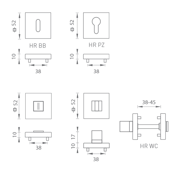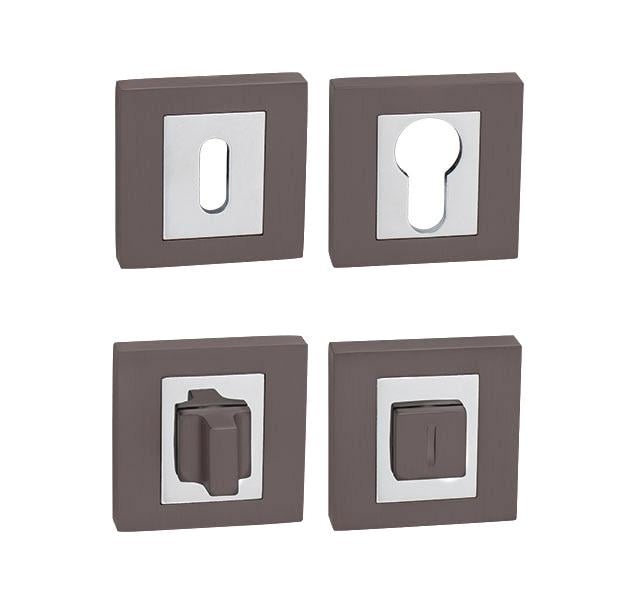 Čtvercová rozeta je vyrobena ze zamaku a hliníku a je povrchově upravena. Rozeta má rozměry 52 mm x 52 mm, tloušťku 10 mm a má oválný otvor pro vnitřní klíč (BB), otvor pro cylindrickou vložku (PZ) nebo WC sadu se zabudovaným klíčem. Balení obsahuje 2 ks rozet (pár) a toaletní rozety jsou součástí balení jako set.