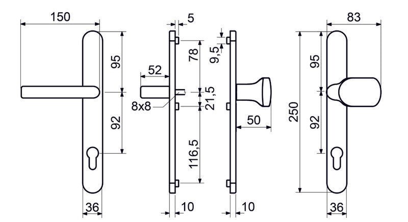 Kvalitní rukojeť/rukojeť přizpůsobená přizpůsobená pro plastové dveře s tloušťkou 78-88 mm. Obsahuje všestranné šrouby, které lze přizpůsobit až 40 mm minimum, čtvercové vřeteno 8x8 mm a středovou vzdálenost 92 mm. Dodává se s třemi spojovacími šrouby M6xx100 mm pro efektivní a zabezpečenou instalaci.