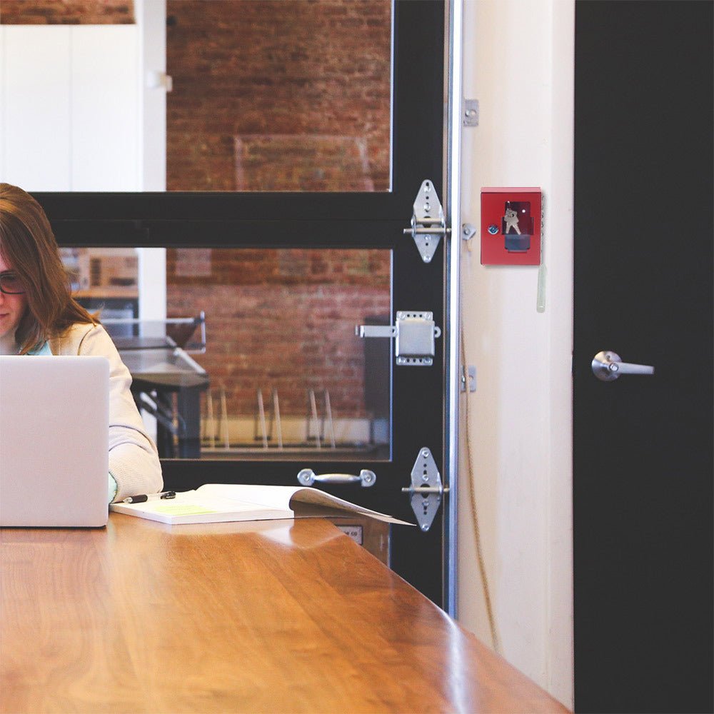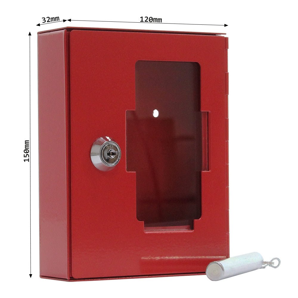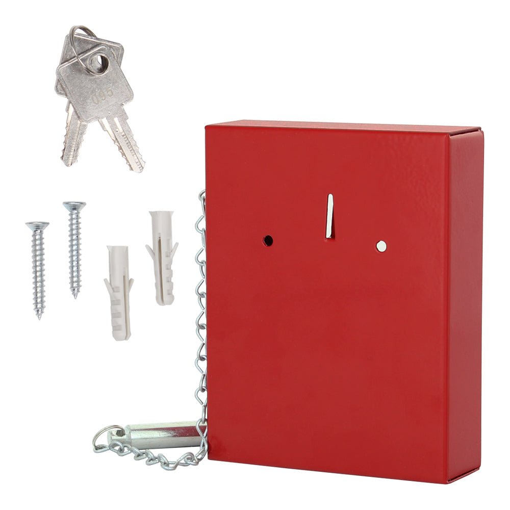 Červená schránka na klíče, která se používá k uložení důležitého klíče nebo svazku více klíčů. V případě potřeby lze sklo rozbít pomocí přiloženého kladiva. Součástí balení je materiál pro kotvení skříně do zdi.