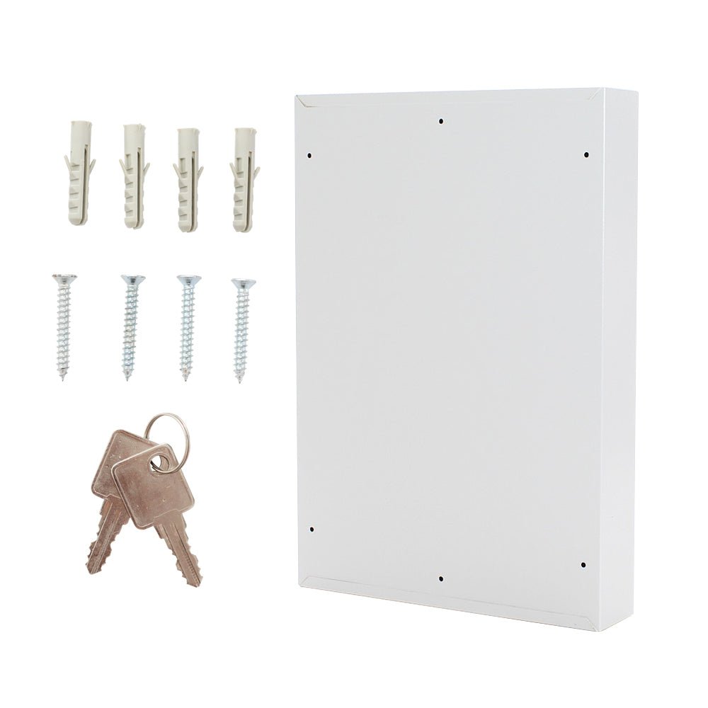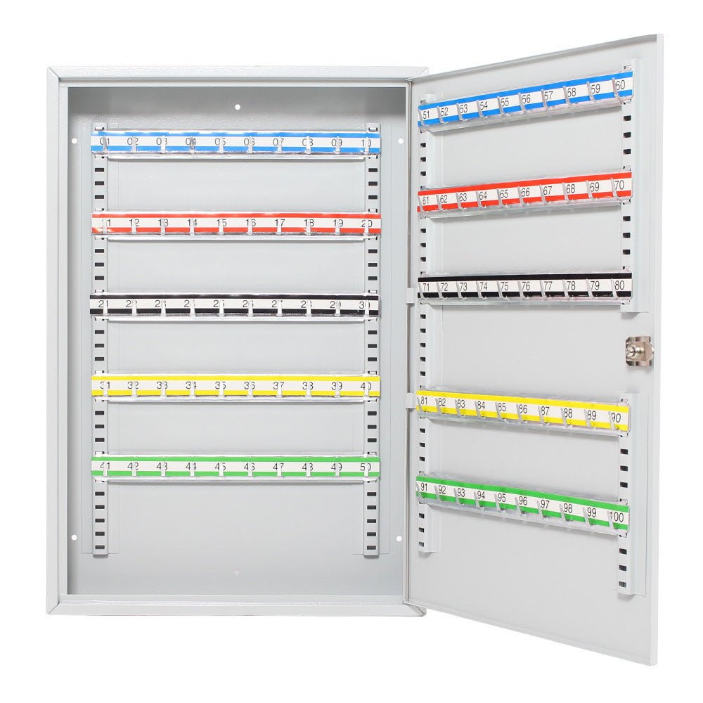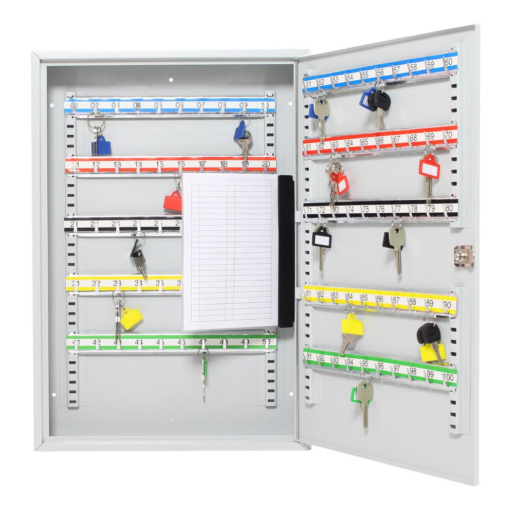 Schránka na klíče S100 umožňuje přehledné uspořádání kláves. Je vyroben z vysoce kvalitního ocelového plechu a obsahuje prostor pro 100 pozinkovaných háčků na klíče. Lamely, na kterých jsou háčky upevněny, lze svisle posouvat. 100 barevných tagů lze použít pro lepší záznamy. Balení obsahuje potřebný kotevní materiál pro uchycení na zeď.